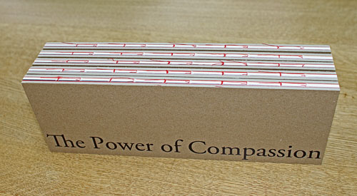 The Power of Compassion 2014 年 8 月 19 日 火曜日 表紙 加賀Aクラフト4枚合紙 黒箔押し 本文 b7トラネクスト99Kg 墨1C/1C 56ページ 見返し タントN-52 100Kg 製本 糸かがり 表紙+見返し+本文接着 サイズ 105×297×12 リヴオン様 デザイン玉利様 「ダライラマ法王 慰霊法要 講話集」 「The Power of Compassion」 慈悲の力