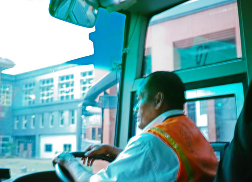 空港の移動バス。運転手さんがニヒルで乾いていた。