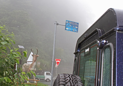 土砂降りの雨の中、つづら折りの道はどこまでも続きます。