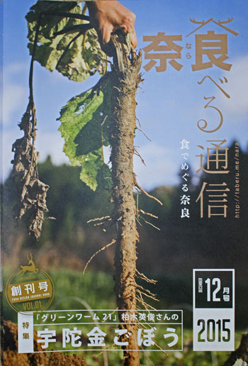 奈良食べる通信 創刊 2015 年 12 月 18 日 金曜日 奈良食べる通信が今月より隔月で始まりました。 創刊号は「宇陀金ごぼう」地味だが癖があり味がある、 奈良らしい食材だと思いました。海は無いけど、伝統野菜の宝庫です。 表紙のロゴは金刷りです。 お申し込みは奈良食べる通信ウェブサイトから http://taberu.me/nara/
