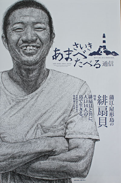 さいきあまべたべる通信 2017 年 7 月 24 日 月曜日 2号目は蒲江屋形島の緋扇貝。人物は後藤猛さんです。 でっかくイラストで後藤さんだけの表紙です。其の物ズバリ 主食は後藤さん、おかずは緋扇貝。離反、インド放浪、帰郷、再出発。 屋形島に行きたくなること間違いなしです。